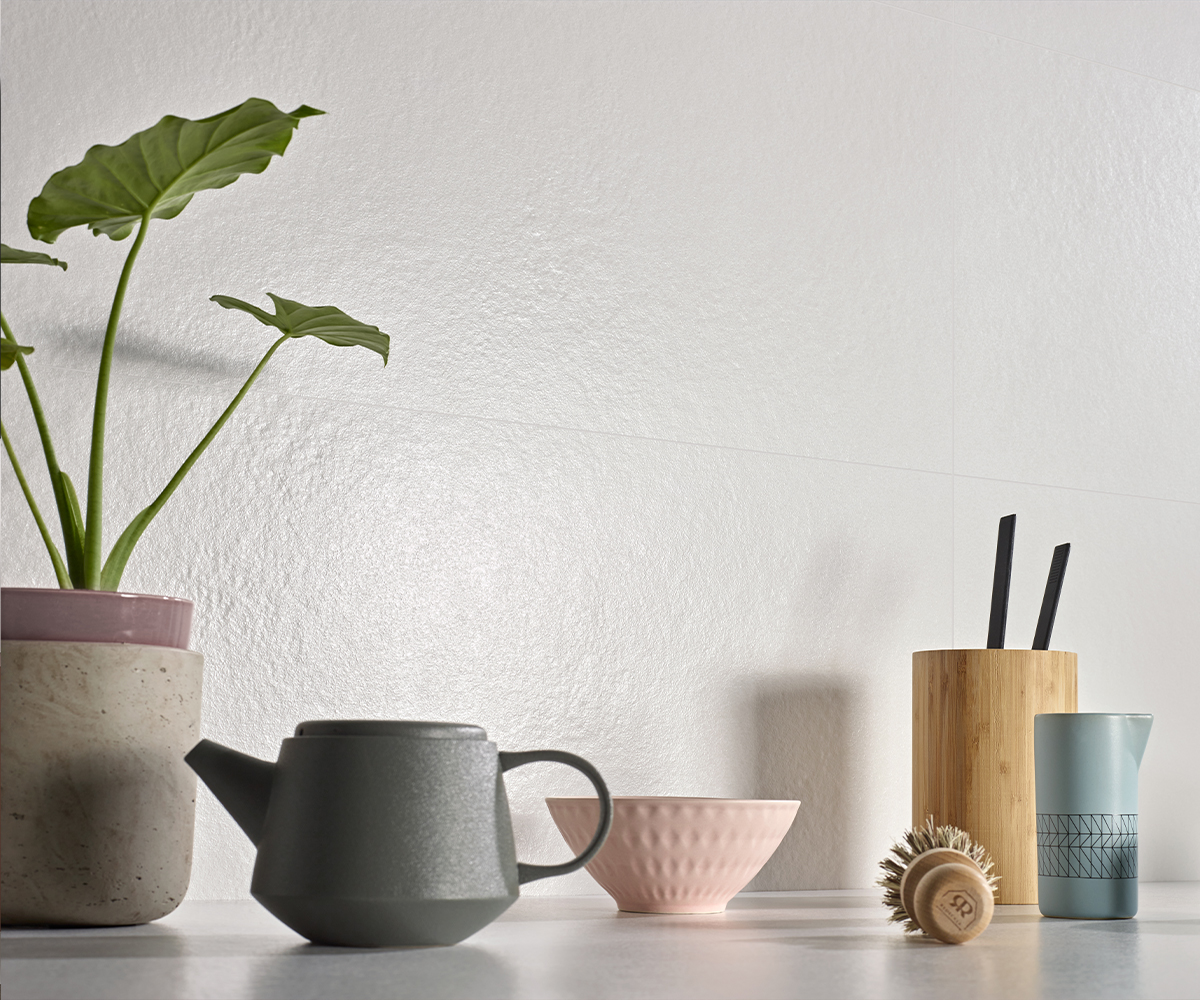 Mit ihren unterschiedlichen Texturen und den leichten Spuren von Glanz sind die Fliesen eine attraktive Keramiklösung und auch perfekt als Ergänzung von anderen weißen Kollektionen geeignet. Die Serie ist Teil der KERMOS fineline Kollektion, die besonders dünne und großformatige Fliesen vereint. Durch die geringe Stärke der Fliese ist eine Raumgestaltung mit edlen, dezenten und filigranen Ecken und Kantenabschlüssen möglich.
