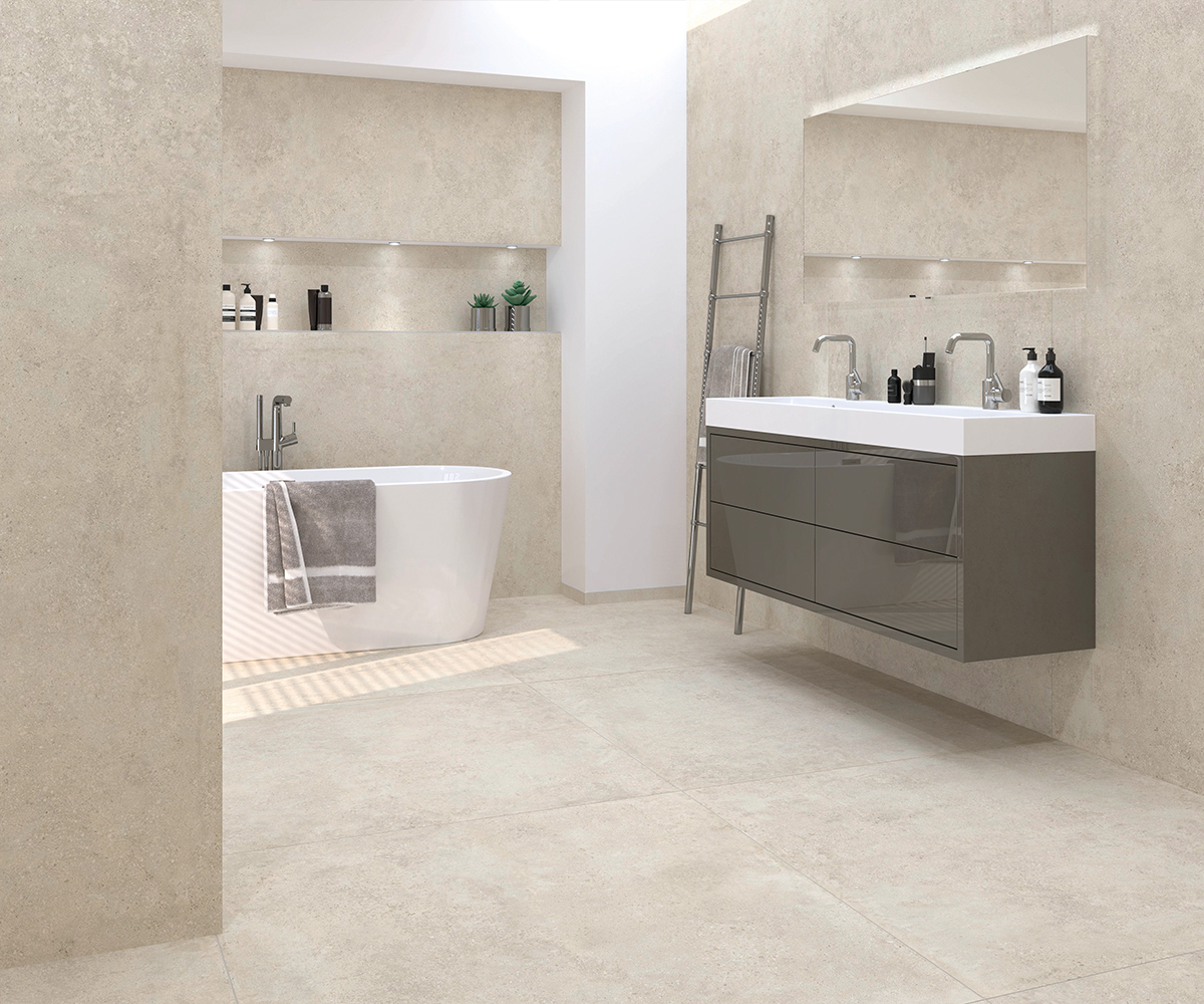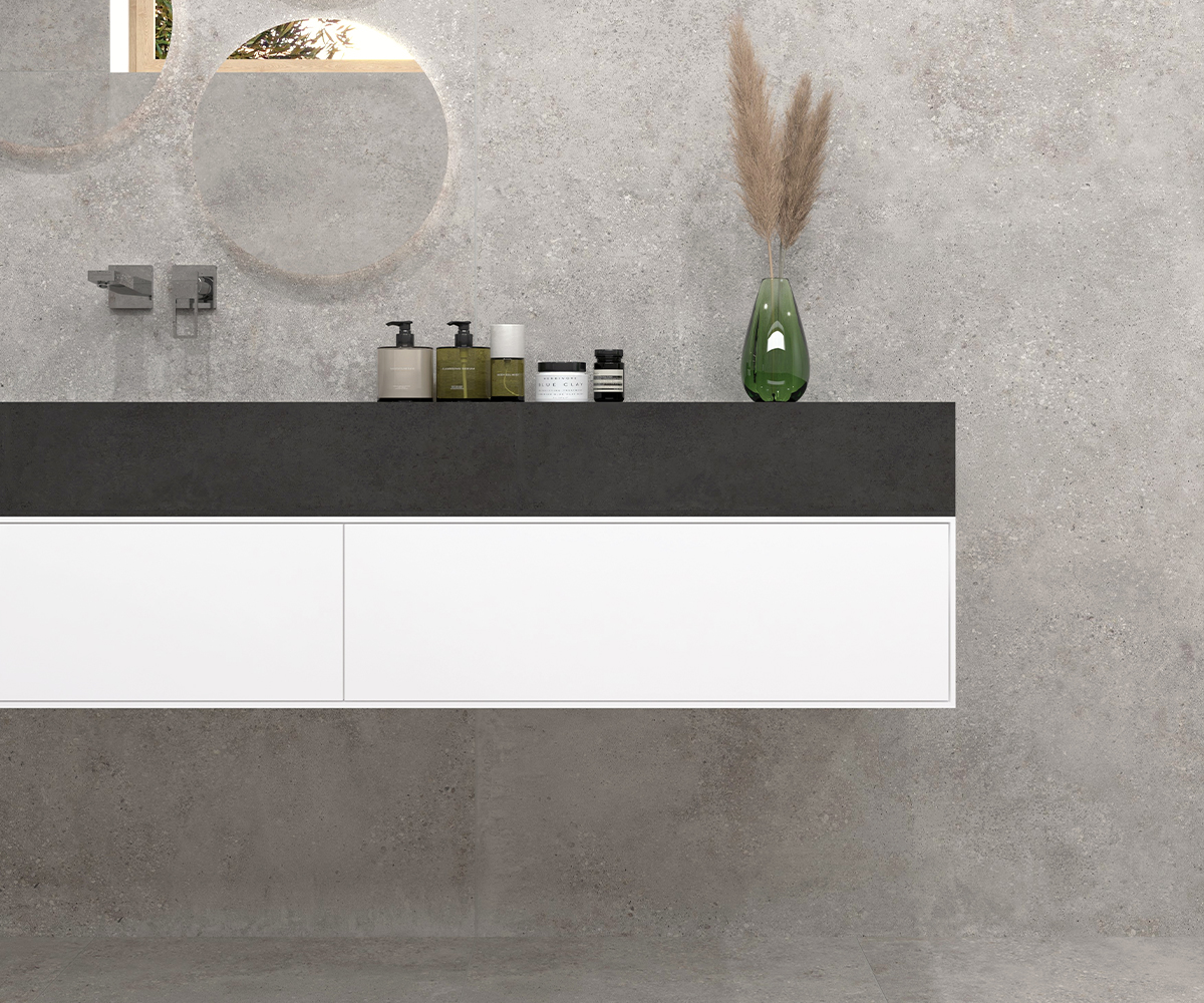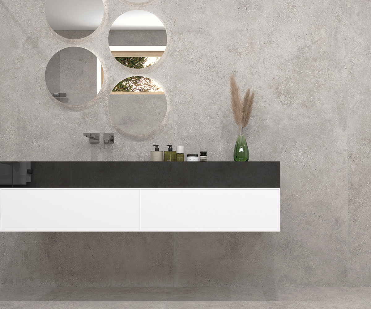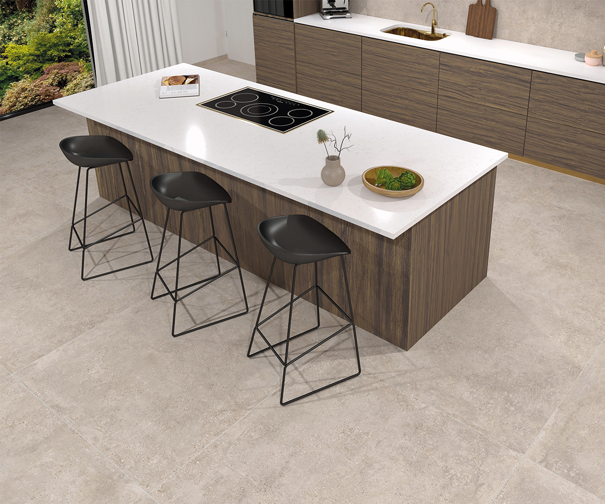 KERMOS Solana combines soft light with a natural stone and concrete look, creating a warm, authentic atmosphere in any room. The variety of colours and formats offers countless design options for walls and floors.