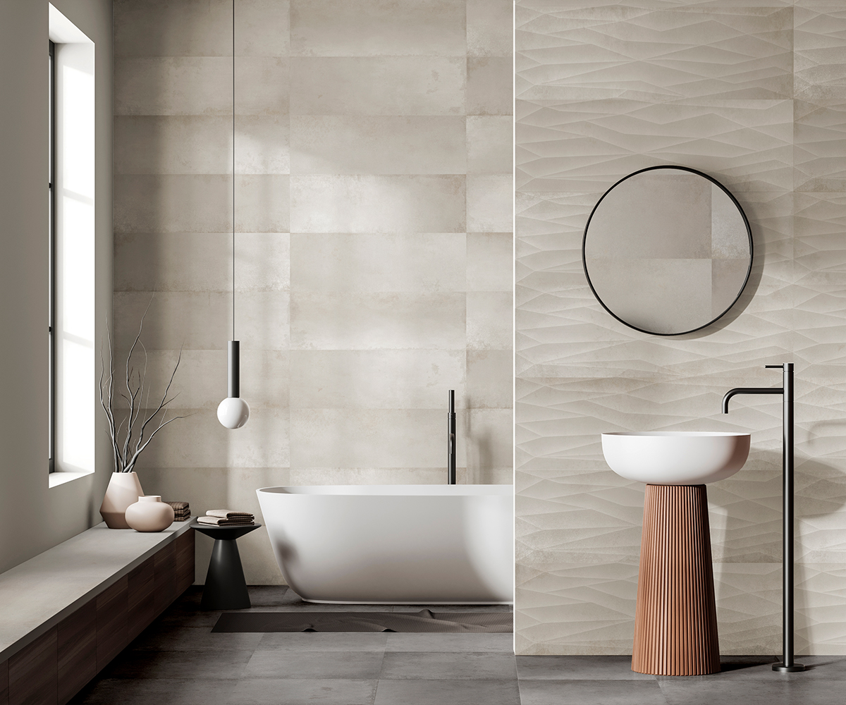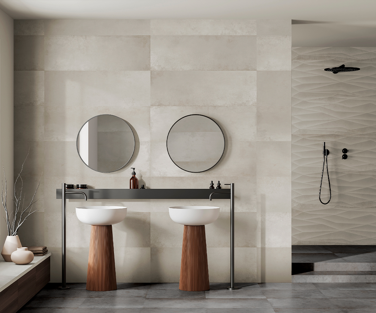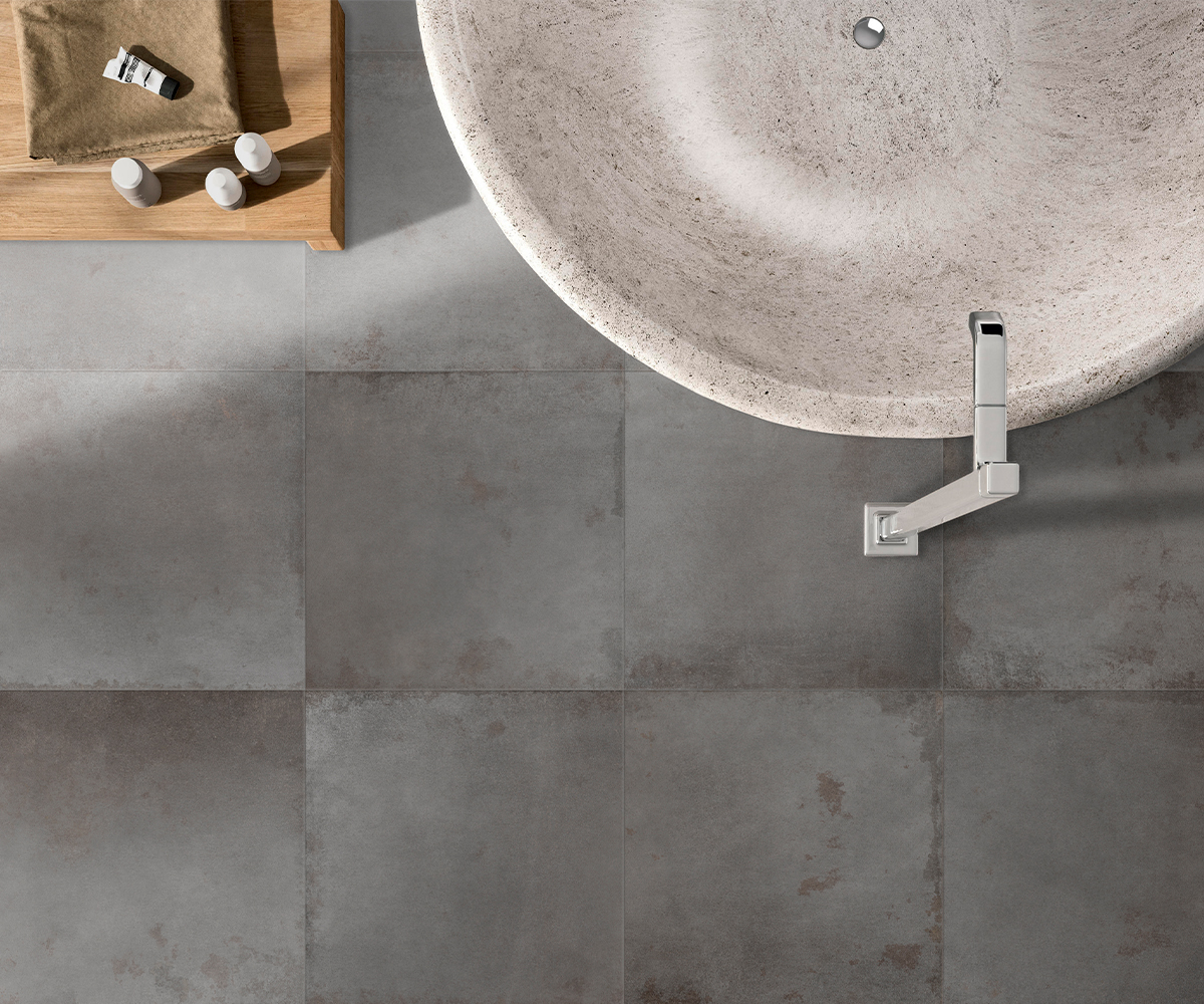 KERMOS Travel impresses with its metal-cement effect, which creates a contemporary and stylish atmosphere on both walls and floors. Perfect for an exclusive and expressive interior design style, this tile series offers numerous design options.